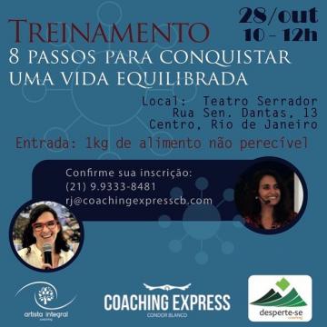 A Condor Blanco Internacional realiza no dia 28 de outubro, das 10h ao meio-dia, o treinamento 8 Passos para uma vida equilibrada, no Teatro Serrador, no Centro do Rio. O curso busca a capacitação de pessoas interessadas em organizarem seu tempo, suas prioridades e todas as demandas do dia a dia. O treinamento será feito pelas master coaches Marcela Barshalay e Márcia Taliyaki. Para participar basta apenas levar 1 kg de alimento não perecÃvel.