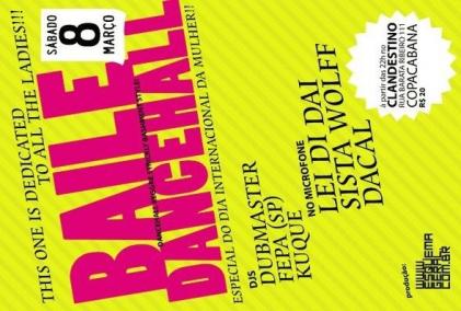 No dia 08 de março, sábado, Cristiano Dubmaster e Kuque (Digitaldubs Sound System) comemoram o Dia Internacional das Mulheres com a festa “Baile-Dancehall" no Clandestino. Os djs do coletivo irão tocar as novidades e os clássico do dancehall jamaicano aliados ao som mais sério do funk carioca, além de mash ups e produções exclusivas!