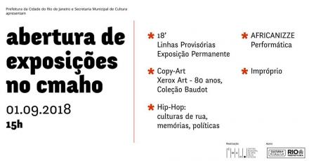 O Centro Municipal de Arte Hélio Oiticica inicia o mês de setembro com a abertura de cinco exposições previstas para o dia 1º/9, sábado. As mostras ‘18’ Linhas Provisórias Exposição Permanente’, Copy-Art / Xerox Art 80 anos - Coleção Baudot', ‘Impróprio’, ‘Hip Hop: culturas de rua, memórias, polÃticas’ e a mostra com mistura de performance ‘Africanizze performática’ ocuparão todas as galerias do centro de arte. O público poderá conferir ao longo do percurso instalações, vÃdeos, pinturas, fotografias, impressões e performances que abordam questões sociais, étnicas, econômicas e polÃticas e que, juntas, dialogam entre si e também com a linha curatorial do espaço, que possui desde março a direção de Alice Alfinito.