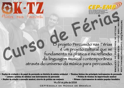 A realização desse projeto estabelece metas e desdobramentos para o grupo K-TZ que se propõe a realizar e mediar as atividades da oficina, apresentar e divulgar o trabalho desenvolvido com os alunos ao longo do curso e mostrar o trabalho desenvolvido pelo grupo para o público de Brasília e principalmente para o público da Escola de Música de Brasília, responsável pela formação de várias gerações de músicos e com um papel fundamental na vida cultural da cidade. O projeto “Percussão nas Férias” quer dar continuidade a uma experiência de muito sucesso vivenciada em 2007, onde foram ministradas três semanas de oficinas gratuitas de percussão contemporânea para jovens e adultos com as mais variadas formações musicais, ou mesmo sem nenhuma experiência musical no Espaço Cultural Renato Russo 508 Sul.