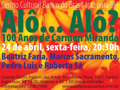 Em comemoração ao centenário de uma das mais renomadas cantoras da música brasileira, o Grande Teatro do Palácio das Artes recebe o show Alô... Alô? Cem anos de Carmen Miranda em única apresentação, dia 24 de abril. No repertório, clássicos da cantora do inÃcio da carreira até a projeção internacional conquistada em Hollywood e Broadway. Do ritmo carnavalesco ao junino, sucessos brasileiros darão um gostinho de nostalgia, com composições de Ary Barroso e Assis Valente.