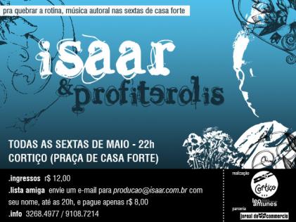 Para quebrar o jejum de temporadas de shows de artistas locais em Recife, a cantora, compositora e percussionista Isaar estréia nesta sexta-feira uma série de três apresentações, por três semanas, sempre às sextas-feiras, no Cortiço, em Casa Forte (Recife-PE). Isaar leva ao palco o repertório do seu elogiado disco solo “Azul Claro†e mais algumas novidades. A abertura de todas as noites, às 22h, fica por conta da talentosa banda Profiterolis com seu som também autoral.