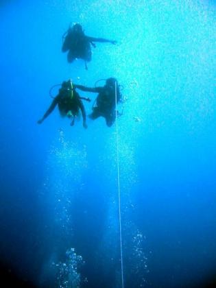 Fotografia de mergulhadores em Fortaleza que, devido à correnteza, descem por cabo para não serem levados por ela.