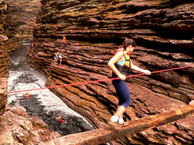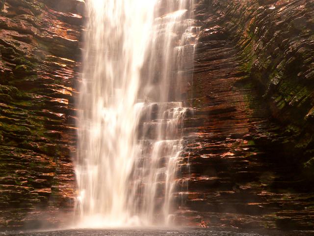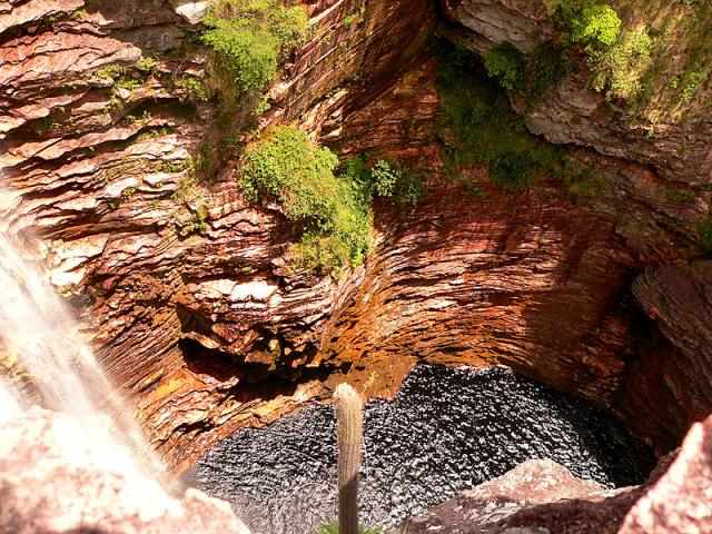 Cachoeira ao meu ver a mais bonita do Brasil.. ao menos a mais bonita que já vi. Um lugar incrÃvel.. uma queda de 80 metros dentro de um buracao mesmo, enorme, todo emoldurado em pedras folheadas. Na chegada à cacheira, um canyon ultra fotogênico.