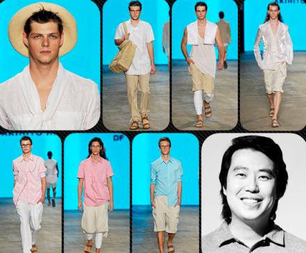 O resultado deste visual é um homem desbravador de horizontes, desapegado das convenções, com uma elegância cheia de bossa e pronto para encarar as altas temperaturas urbanas. O corpo é exposto, com transparências e decotes, ao mesmo tempo em que é coberto por leggins e sobreposições. Akihito aposta nos bolsos utilitários, recortes cavados, deslocamento de botões, assimetria, minicolete e pregas.