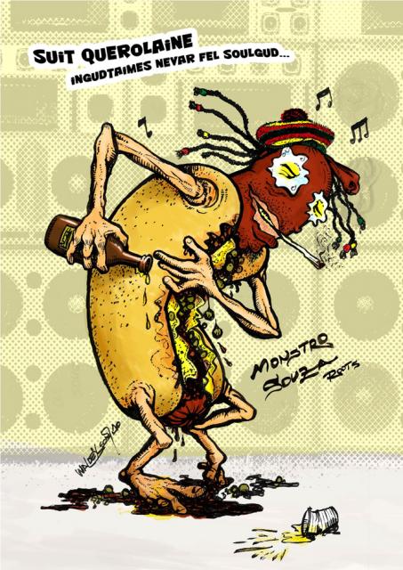 O Monstro Souza é um cachorroquente de um metro e oitenta, garoto de programa, 100% discreto e gostoso, autofágico e assassino! Criação literária de Bruno Azevêdo e artÃstica de Gabriel Girnos, o monstro ganha vida após circunstâncias misteriosas numa noite de tempestade. Era um cachorro-quente comum, que sai do forno numa barraquinha de festifud e, por uma razão estomacal qualquer, acaba sendo abandonado no cenário cruel de um meio-fio. A partir dali, como efeito de um Gyodai imaginário, o monstro cresce e ganha vida, passando a perseguir seu criador. Frankenstein? De jeito nenhum. Pois o monstro, a exemplo do romance-colagem de Azevêdo e Girnos, é quase uma criação coletiva. "A questão do conflito criador/criatura, ao menos na fritura do livro, não tava muito na minha cabeça", diz Bruno. Tanto que o barraqueiro aparece na história como mero coadjuvante, o primeiro perseguido mesmo é o Diogo Henriques(R), personagem inspirado, como tantos outros, no cÃrculo de amizades dos autores. Mas é ainda esse mesmo barraqueiro quem lhe dá nome: o Monstro Souza é uma referência ao Sousa, vendedor de cachorroquente há mais de 15 anos no Centro de São LuÃs, e que patrocinou metade da impressão do livro depois que soube que seria personagem, mas não gostou do santinho de candidato dele no final, pois se arrepende de um dia ter tentado a carreira polÃtica.