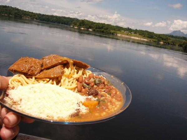 No custo da passagem está incluída a alimentação básica: café, almoço e a janta, todos em sistema self-service. O barco Tanaka Neto VI possui um sistema mais libertário para os passageiros que podem se servir e comer em qualquer lugar, na maioria das embarcações, uma única mesa em cada andar provoca filas enormes e uma constrangera pressão silenciosa de quem está em pé, aguardando a vez, sobre quem está comendo. Aqui não, montei um prato quantitativamente digno para alguém que não tomou café e fui curtir o visual no terraço, enquanto um casal se acomodava para comer no chão. Nada demais, é apenas mais um dos muitos hábitos mantidos por indígenas e descendentes.
