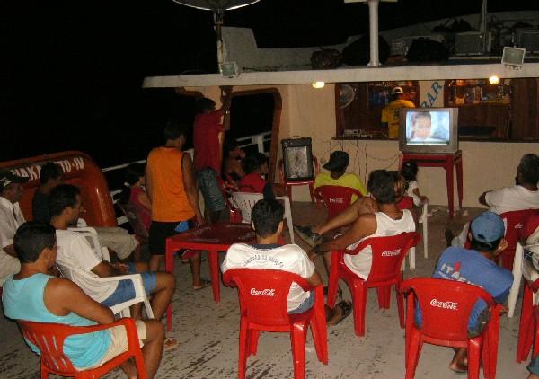 Quando escurece, a televisão é ligada no terraço para acompanhar as novelas e o Jornal Nacional via parabólica, tarefa só possível graças à abnegação de um dos tripulantes que, de pé, ajusta constantemente a posição da antena para a captação do sinal, isso acontece toda vez que uma TV é ligada durante uma viagem de barco . Às dez e meia da noite o barco atraca em Santa Isabel do Rio Negro, com a televisão já desligada para o retorno do dominó e da música alta.