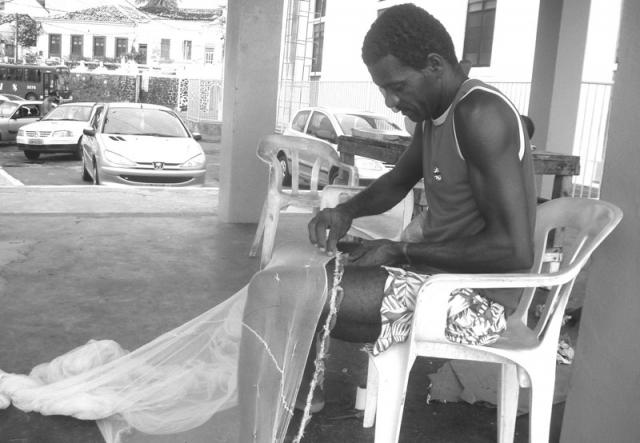 "Completa o pescador da colônia de Itapuã, Nelsom dos Santos, apelidado de Pai Velho.
