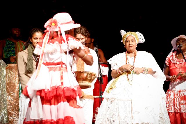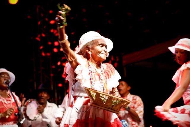 Sambando altiva no palco do X Encontro de Culturas, jogando folhas, distribuindo simpatia e sem perder o ritmo ela coloca um colar de contas em alguém e a platéia aplaude emocionada a mestra do Samba do Recôncavo Baiano.