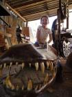 Espalhados por todos os cantos da oficina, a família se ocupa cada qual a sua maneira. Num dos cantos, Osmair Rodrigues da Silva termina de serrar aquilo que, quando finalizado, vai se tornar mais um jacaré de madeira. Suas roupas estão esbranquiçadas com o pó que sobe da peça, mas ele parece já nem se importar. Enroscando-se embaixo da mesa, a netinha do artesão, Karine da Cruz, brinca de montar num dos lagartos já completados e espera o pai terminar o trabalho para servir o almoço.