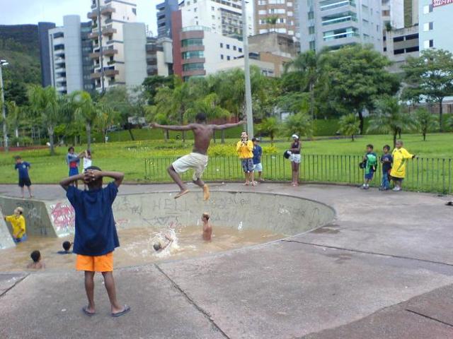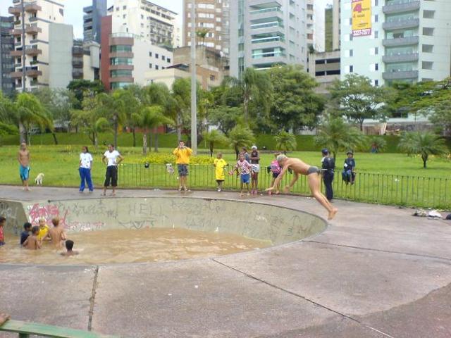 Paramos o carro logo no começo da praça e fomos caminhando em direção a pista. Estranhamente havia muitos garotos em torno do bowl - pista em formato de uma bola no chão lembrando muito as piscinas californianas dos anos 70 - Chegando mais perto ainda, nos surpreendemos com a cena, dezenas de garotos nus, ou quase, nadavam na água suja inserida na pista.