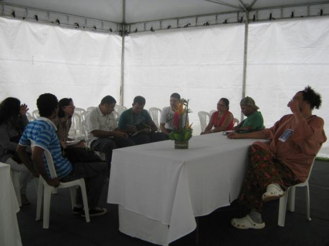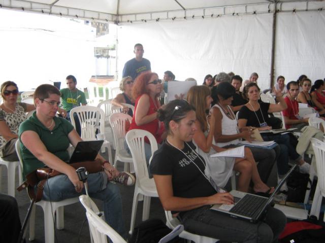 Foi possÃvel visualizar melhor a diversidade presente em outras tendas. Jonas Banhos, da Ong NossaCasa de Cultura e Cidadania (AP), já estava presente com seu programa megafonico Radio NossaCasa Amazônia. Aproveitamos o almoço para conversarmos melhor a respeito de nossas propostas e candidatos. Também tivemos a oportunidade de ter uma media do que estava acontecendo nos outros setores.