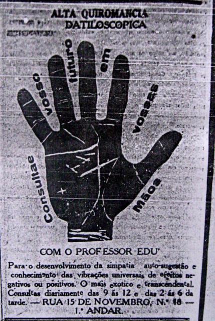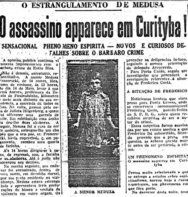 Outro caso famoso e cercado de mistérios foi o assassinato de uma garota de 14 anos chamada Medusa, em Entre Rios, municÃpio de Santa Catarina. Em uma matéria de capa de 1934 lê-se que: “Pessoa muito relacionada e que se entrega a estudos sobre espiritualismo narrou hoje à nossa reportagem um fenômeno em que fora parte. No decorrer desta noite teve a seguinte visão: – Estava agarrando pela gola o assassino de Medusa. E interrogava-o. [...] A visão foi clara e o nosso informante pôde registrar os seguintes sinais do assassino [...]. Esses sinais combinam com os de certo indivÃduo em cuja pista se acham a polÃcia e a nossa reportagem! Tratar-se-á de um sensacional fenômeno espÃrita?†Em 1933, o consultório de um quiromante, localizado próximo à redação do Diário da Tarde, teve um grande anúncio publicado na primeira página com os dizeres “Consultae vosso futuro em vossas mãosâ€. Felizmente, hoje sabemos que a autoridade para praticar e discorrer sobre as artes mÃsticas nesta época foi proporcionada muito mais pelo capital que pela graça divina. Não à toa, em 1942, houve um cadastramento de centros espÃritas da cidade, organizado pela polÃcia, por médicos e farmacêuticos que quiseram evitar a confusão daqueles centros com lugares de práticas populares semelhantes, que recebiam a classificação de “baixo espiritismoâ€.