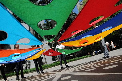 Uma das maiores favelas do Brasil, a Rocinha trouxe um trabalho colorido que lembra um parangolé de Helio Oiticica. E não encanta apenas as crianças. O jogo lúdico, que entre outras atribuições contam a história da comunidade, é uma forma de mostrar a importância das brincadeiras para o desenvolvimento dos pequenos.